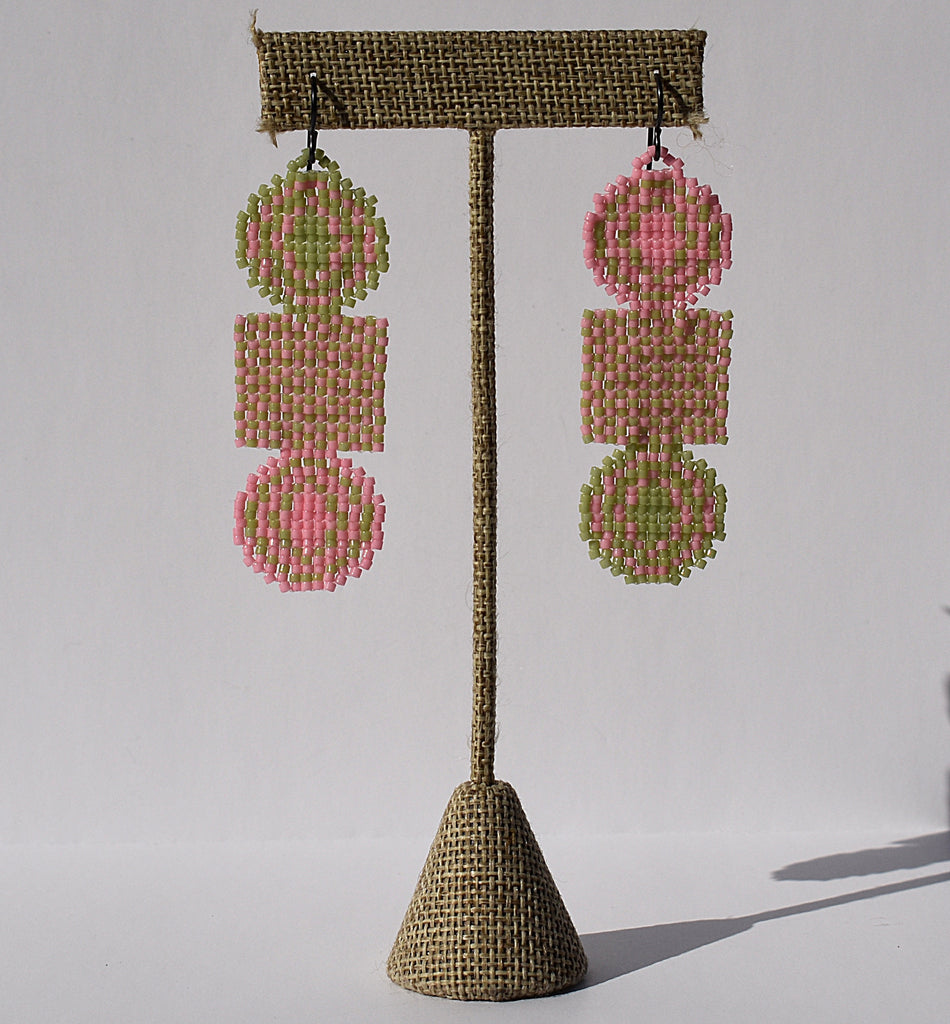 Stacked circle and square shapes beaded earrings on niobium (hypoallergenic) ear wires. Light pink and green colored beads. Total length including ear wires is 3".