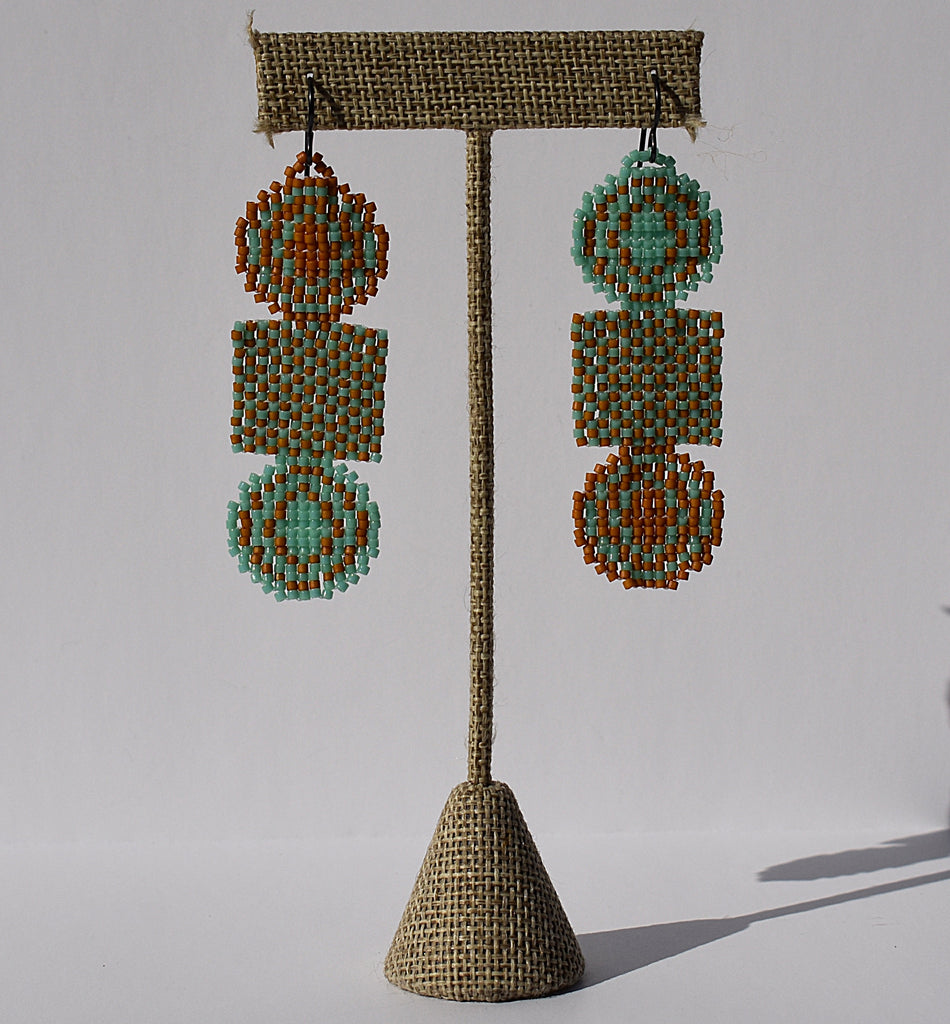 Stacked circle and square shapes beaded earrings on niobium (hypoallergenic) ear wires. Turquoise and siena brown colored beads. Total length including ear wires is 3".