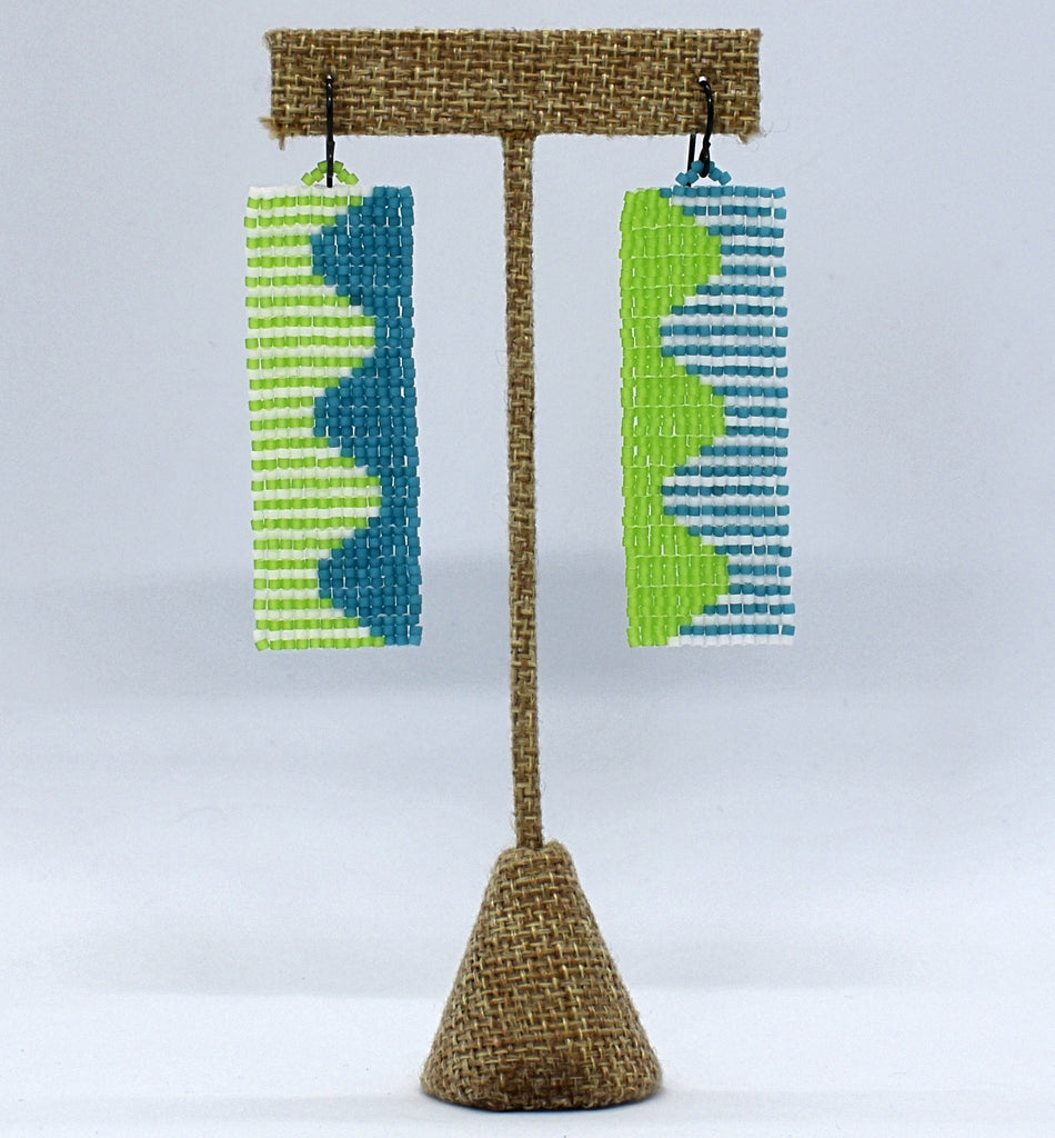 River inspired beaded earrings on niobium (hypoallergenic) ear wires. Blue, lime green, and white colored beads. Total length including ear wires is 3".