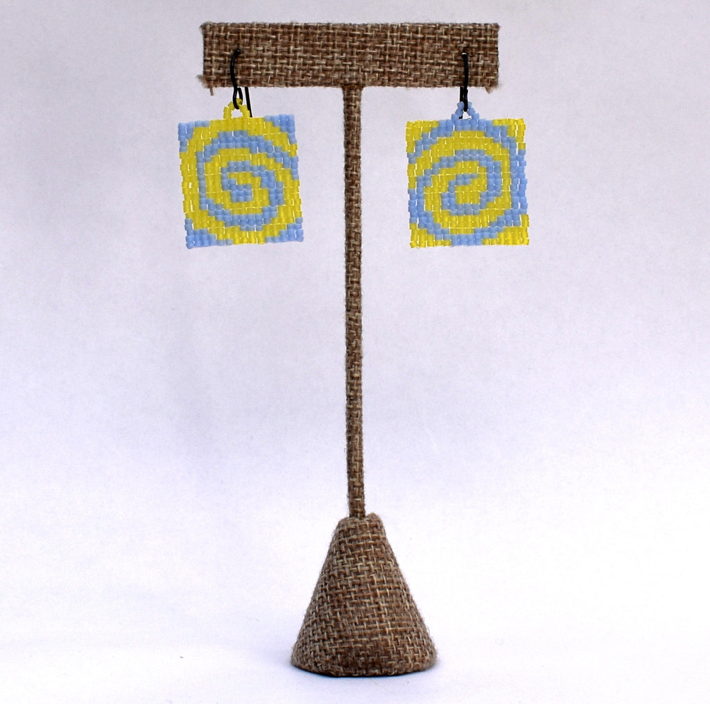 Beaded earrings with spiral pattern on niobium (hypoallergenic) ear wires. Yellow and agate blue colored beads. Total length including ear wires is 1.5". Check out all the fun color variations and don't hesitate to reach out if you'd like a custom colorway!