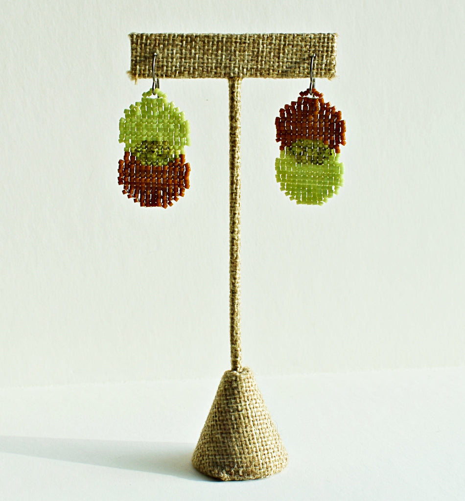 Overlapping circle beaded earrings on niobium (hypoallergenic) ear wires. Pistachio green, green picasso (marble effect) and siena brown colored beads. Total length including ear wires is 2".