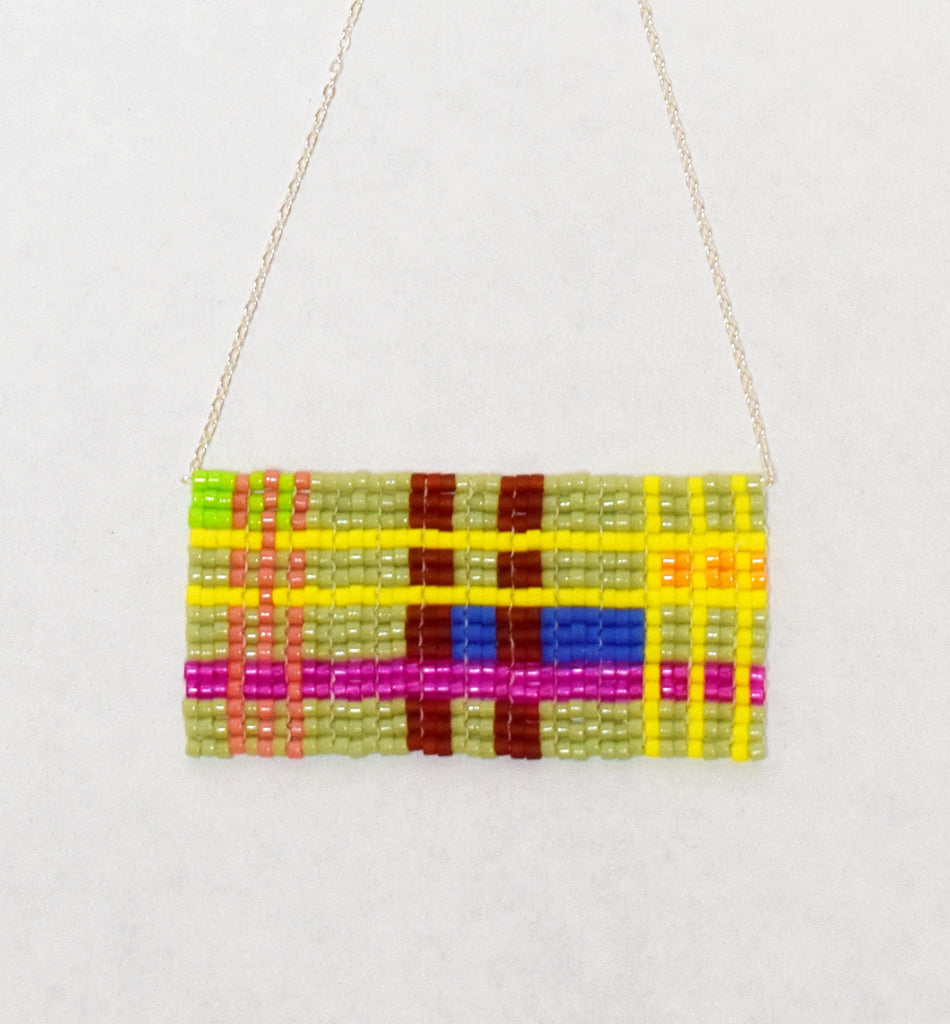Beaded and chain necklace with plaid pendant centerpiece. green, grapefruit pink, yellow, magenta, orange and blue woven bead pendant section measures 2" wide and 1" tall. 18" total length on sterling silver cable chain with spring ring closure.