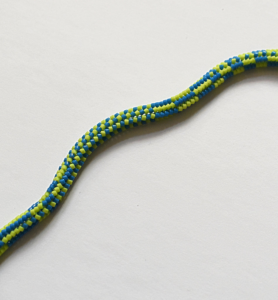 Beaded rope necklace perfect for layering and adding color to any outfit.  19" long with sterling silver toggle clasp closure.  Mixed stripe and check patterns with blue and lime green colored beads.