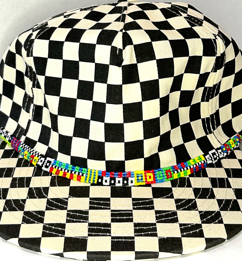 Awesome black and white checkerboard printed flat brim hat blank personalized with a hand beaded band. Adjustable back band. 100% cotton hat.