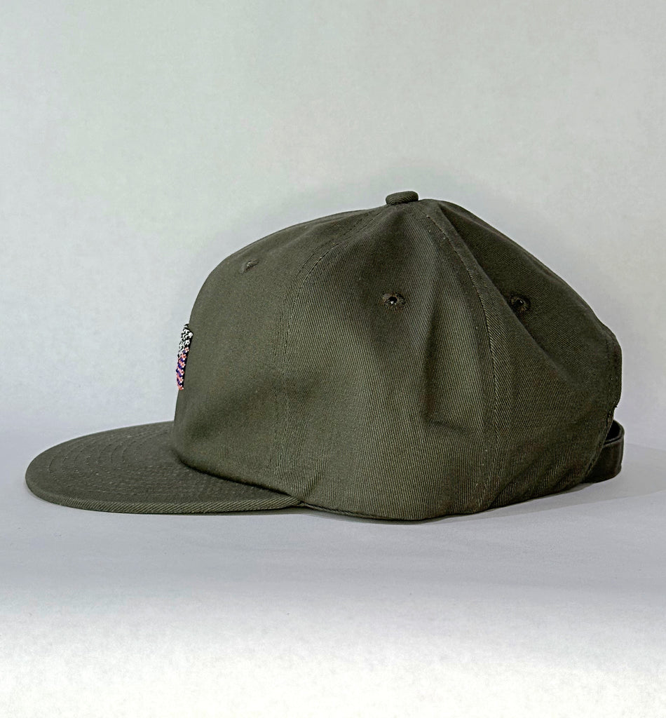 Grey cotton flat brim hat blank personalized with a hand beaded mountain pattern patch. Adjustable back band. 100% cotton hat.