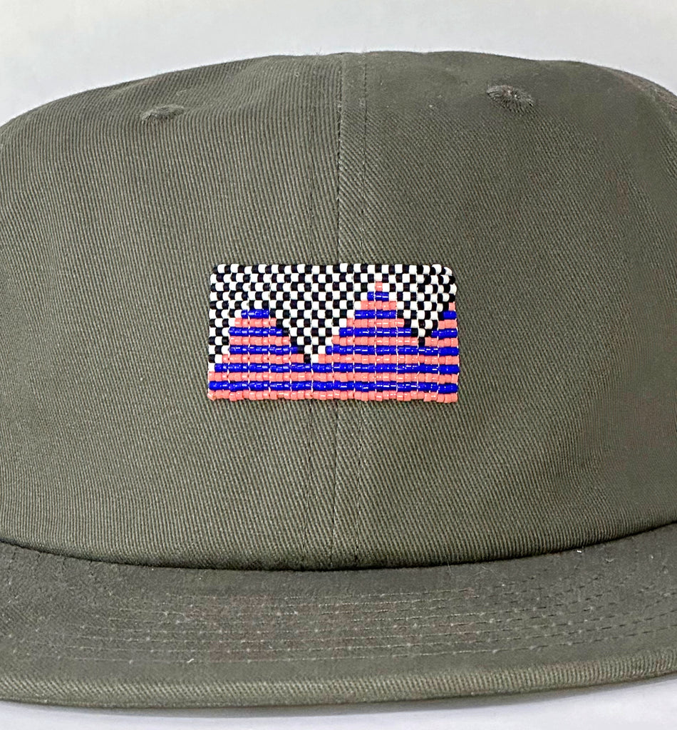 Features a hand beaded patch with blue, pink, white and black colored beads. Japanese glass seed beads are sewn into the hat.