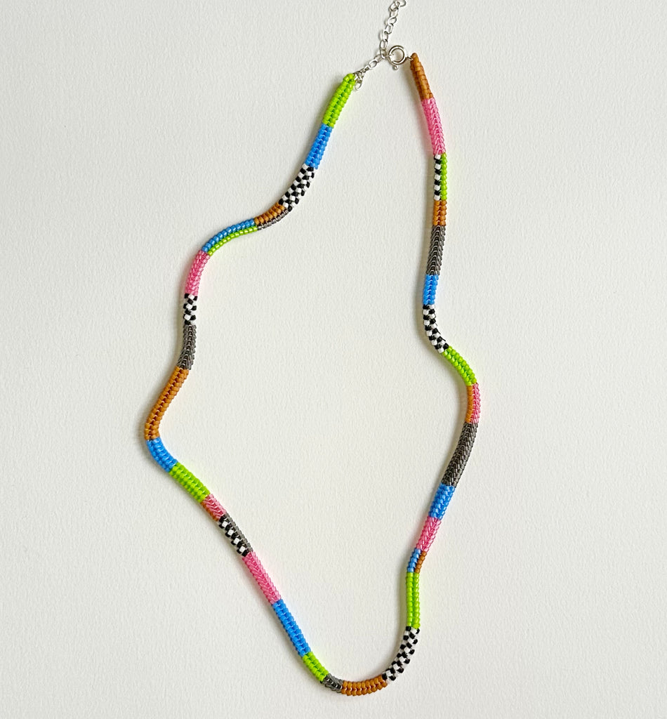 Narrow beaded rope necklace with colorblock patterns. 18" long with sterling silver spring ring clasp closure and 2" of adjustable sterling silver chain.