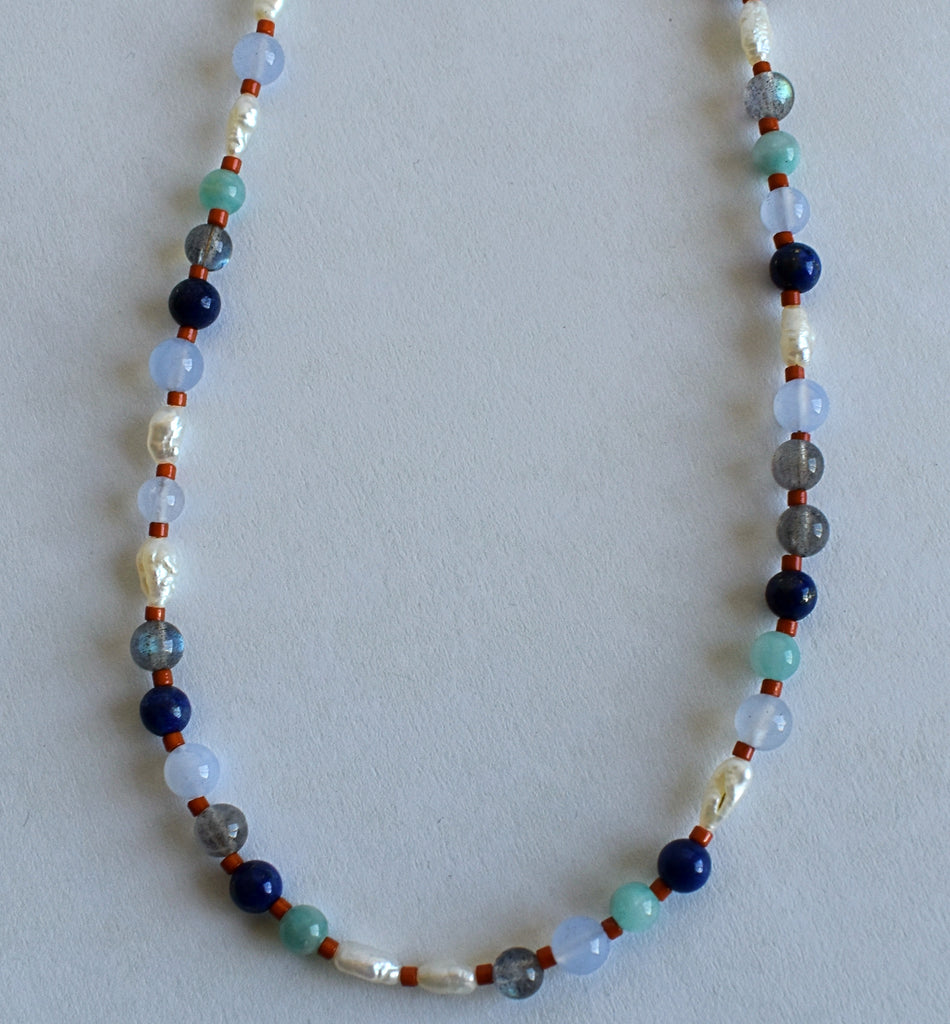 A mix of stone beads and glass seed beads make this the perfect layering choker necklace. Pearl, lapis, blue chalcedony, labradorite and amazonite beads with caramel brown glass seed beads. 15" long with 2" of sterling silver extender chain and sterling silver spring ring clasp.