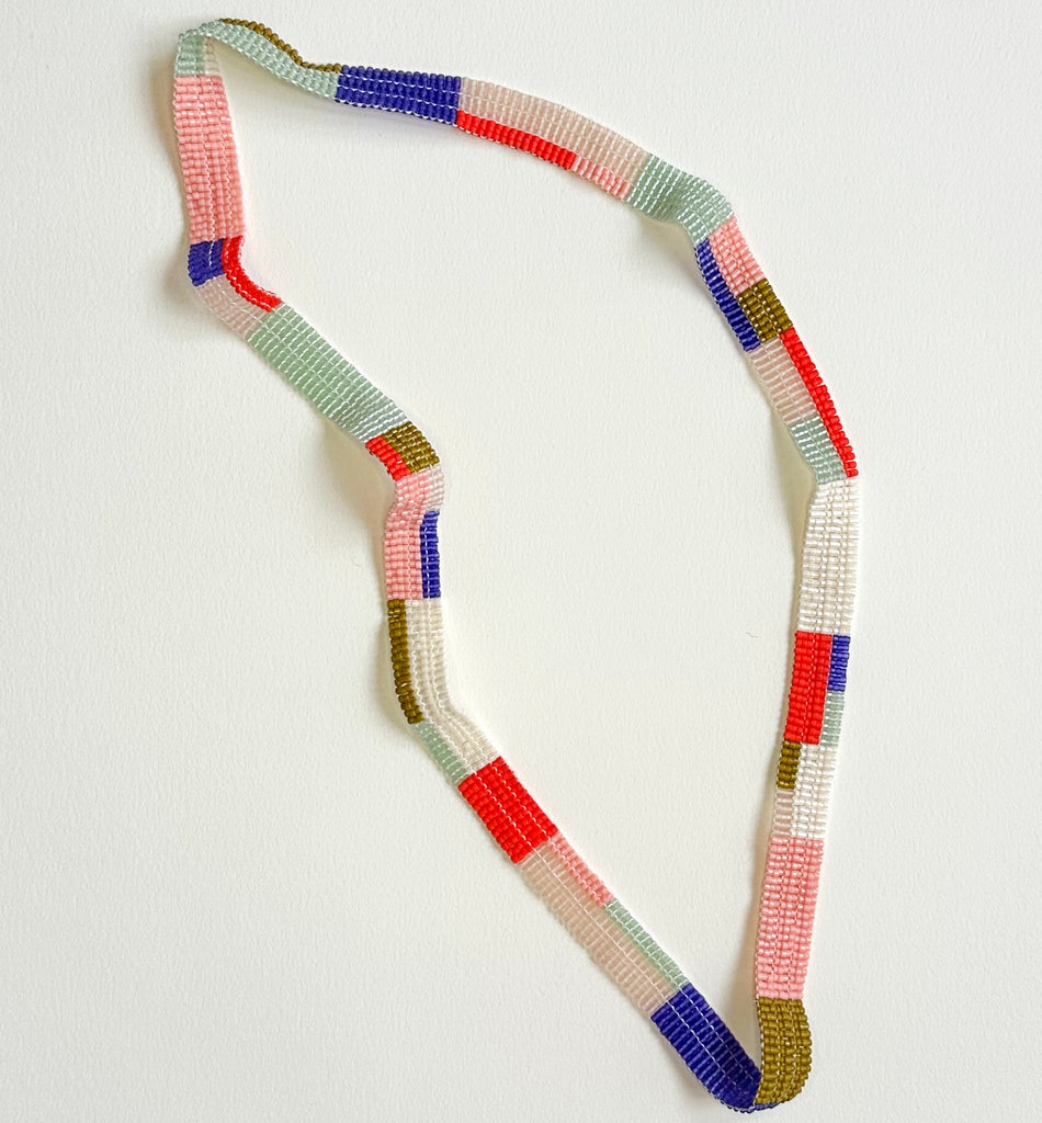 Pastel Colorblock: colorblocked pattern with paprika red, pearl white, peach, olive green, cobalt blue and sage green colored beads.