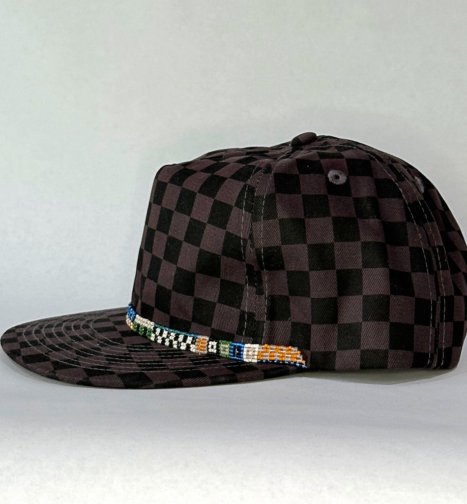 Awesome tonal black and deep brown checkerboard printed flat brim hat blank personalized with a hand beaded band. Adjustable snapback band. 100% cotton hat.
