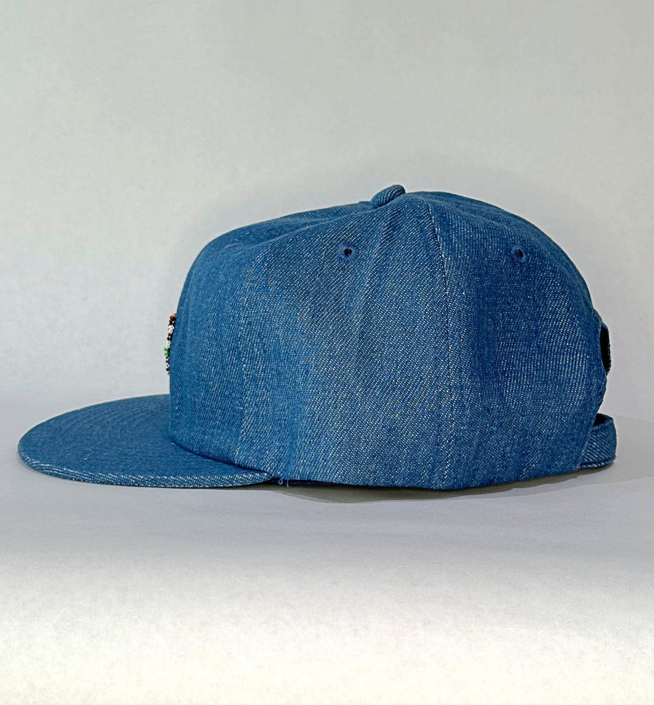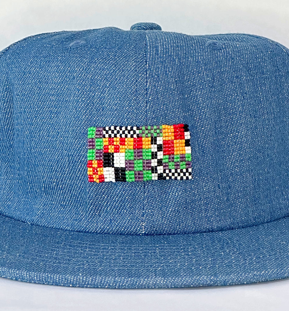 Blue denim flat brim hat blank personalized with a hand beaded memphis inspired patch. Adjustable back band. 100% cotton hat.