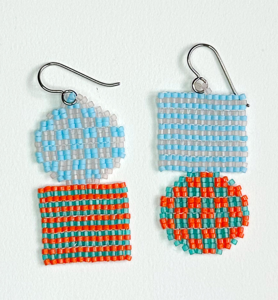 A beaded version of the favorite Sausalito earrings with a fun checkerboard and striped pattern update! Beaded earrings in square and circle shapes on niobium (hypoallergenic) ear wires. Total length including ear wires is 2". Japanese glass seed beads.