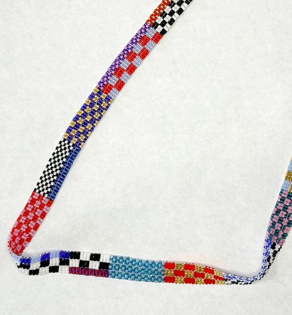 The wide ribbon necklace is a labor of love taking over 7 hours to make each one. 0.5" wide and 25" long without a clasp. Mixed checker pattern with black, white, sky blue, cobalt blue, pink, red, purple, teal, and gold colored beads.
