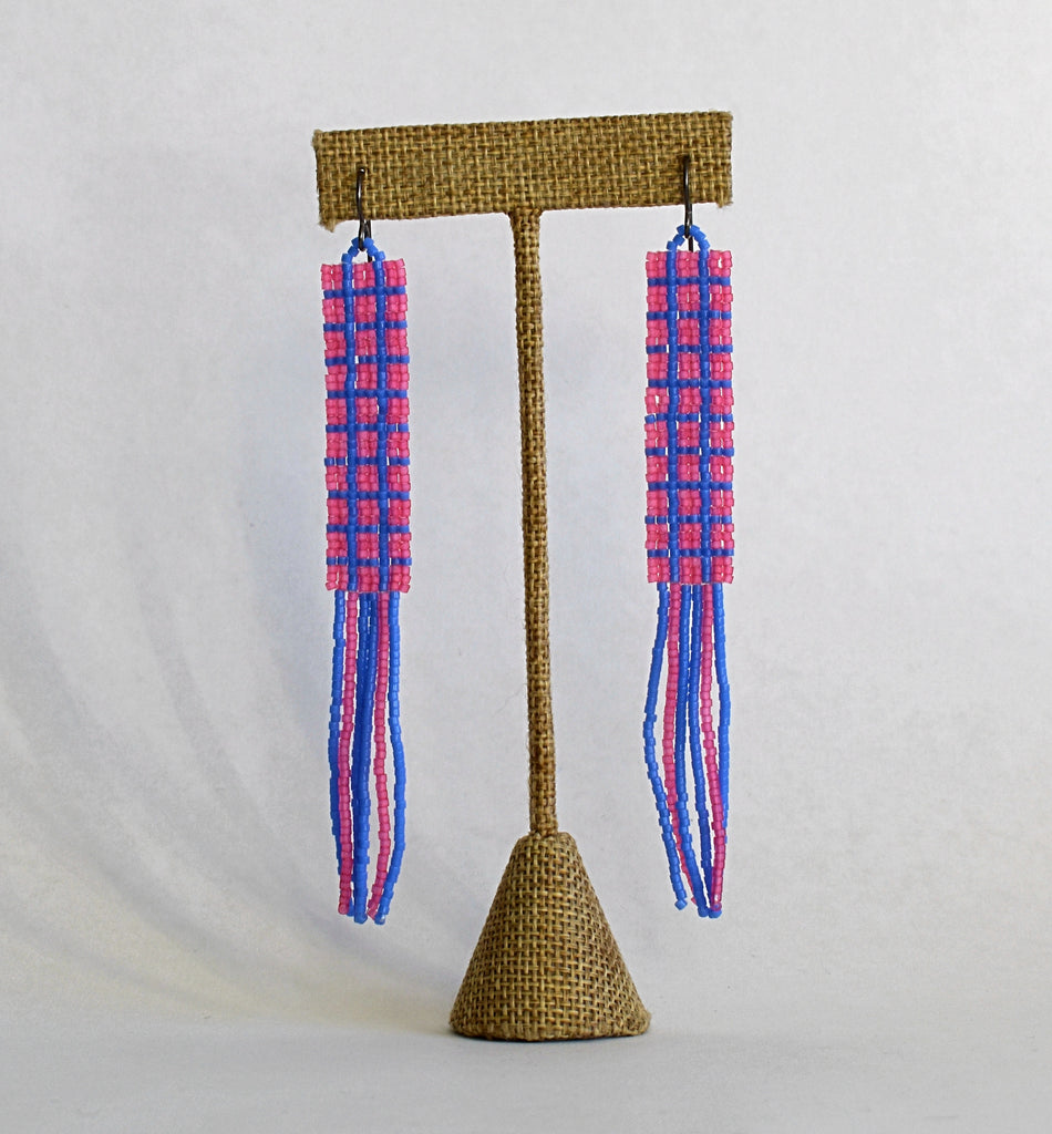 Windowpane patterned fringe beaded earrings on niobium (hypoallergenic) ear wires.  Pink and periwinkle colored beads.  Total length including ear wires is 4.5".
