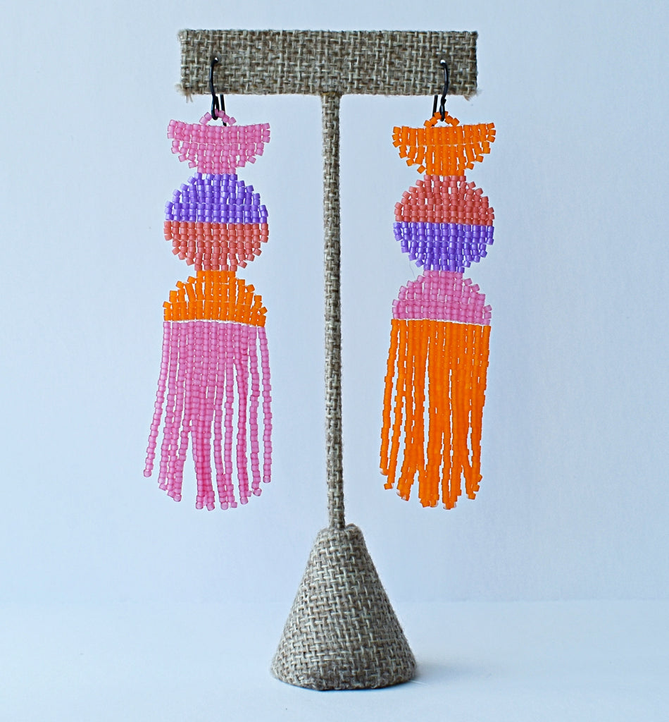 Circle and fringe beaded earrings on niobium (hypoallergenic) ear wires. Pink, orange, purple and grapefruit pink colored beads. Total length including ear wires is 4".