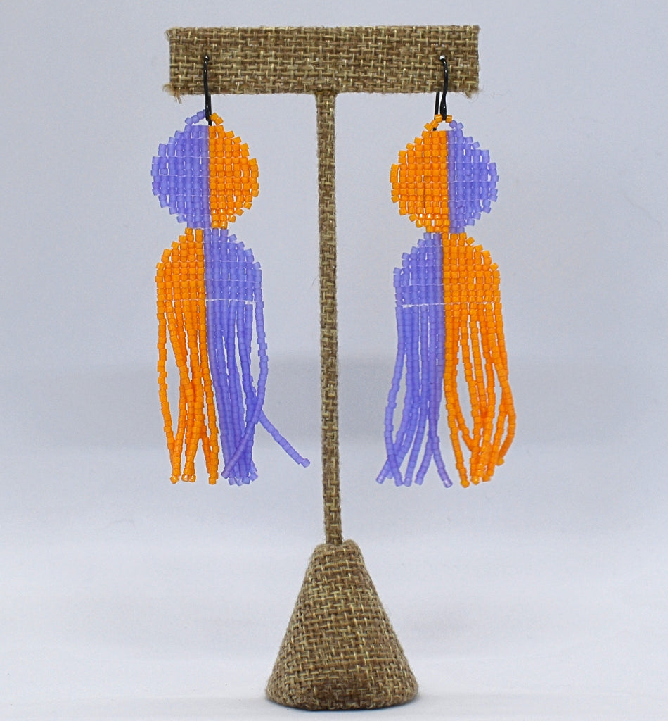 Circle and fringe beaded earrings on niobium (hypoallergenic) ear wires. Bright purple and orange colored beads. Total length including ear wires is 3.5".