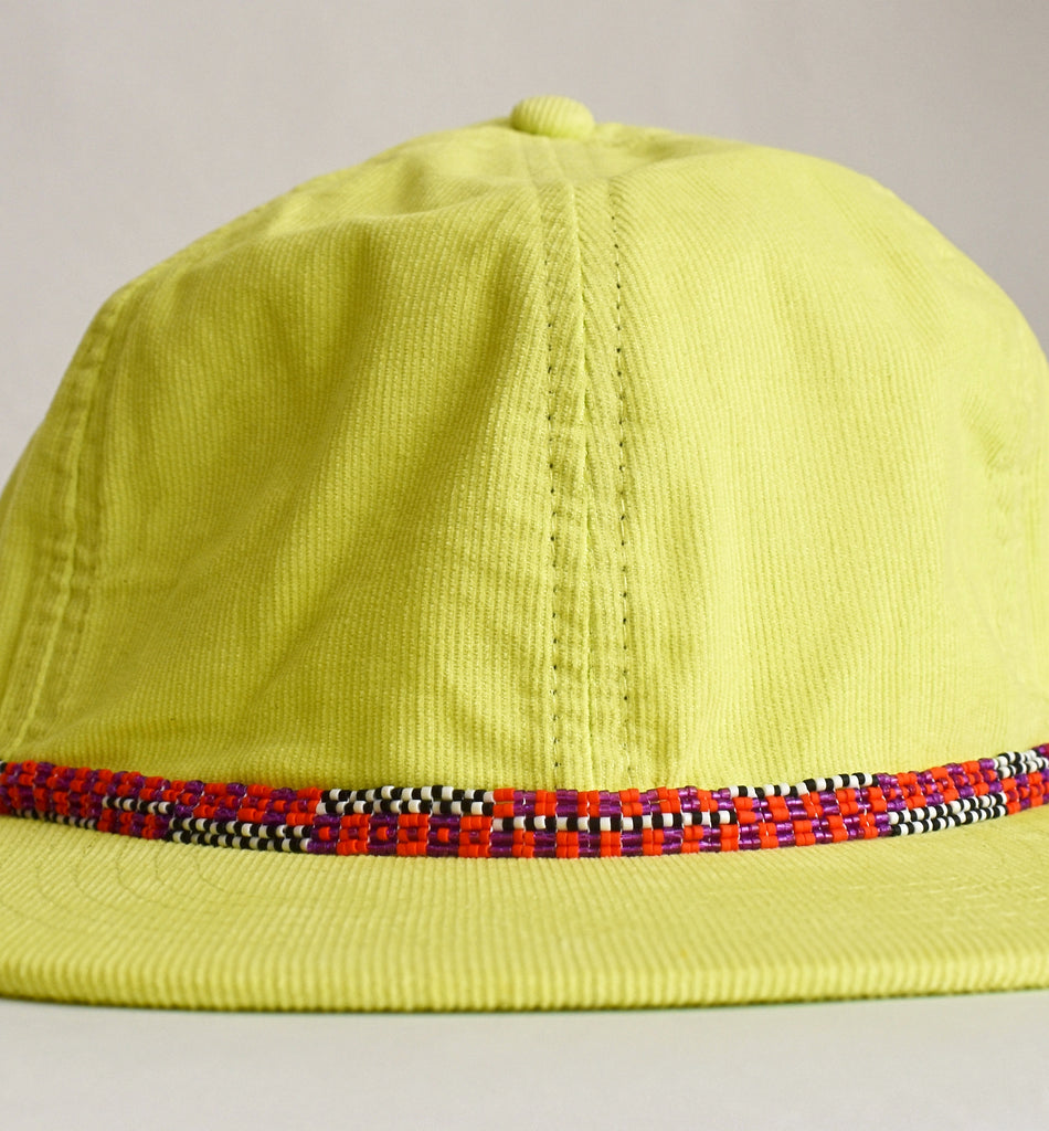 Awesome flat brim citrus bright yellow thin wale cord hat blank personalized with a hand beaded front band. Adjustable back band. 100% cotton hat.