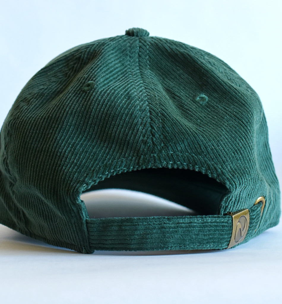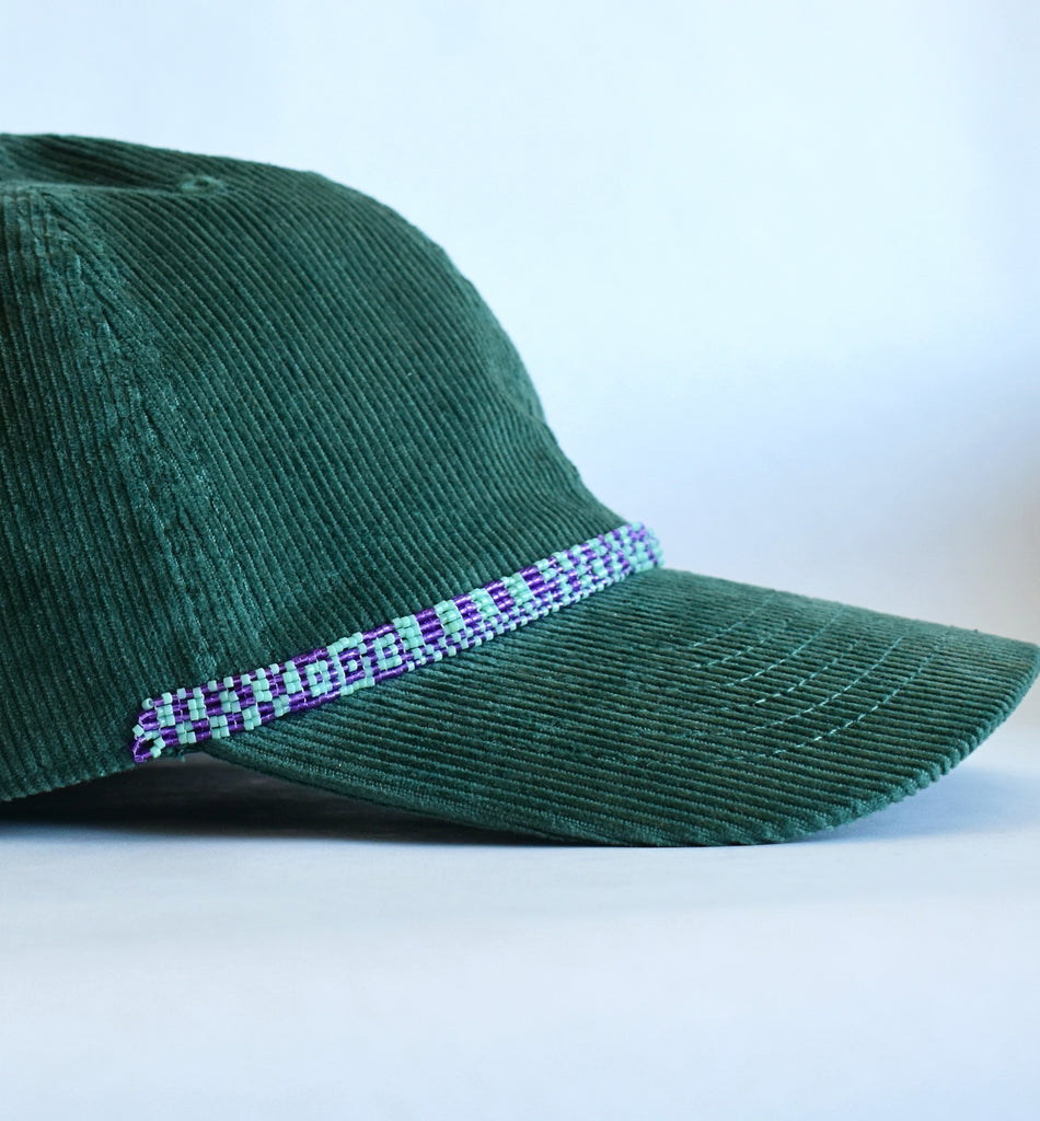 Awesome hunter green corduroy dad hat blank personalized with a hand beaded front band. Adjustable back band. 100% cotton hat.