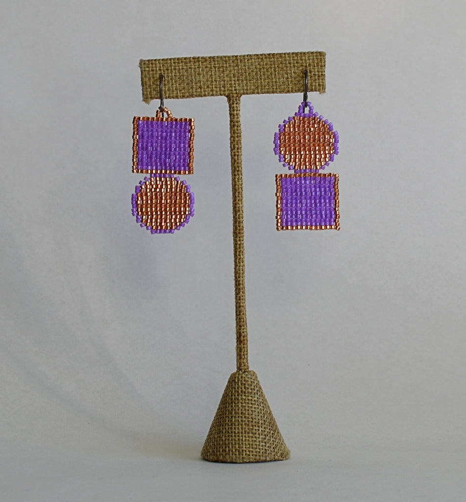 A beaded version of the favorite Sausalito earrings! Beaded earrings in square and circle shapes on niobium (hypoallergenic) ear wires.  Purple and rose gold colored beads.  Total length including ear wires is 2".  Check out all the fun color variations and don't hesitate to reach out if you'd like a custom colorway.