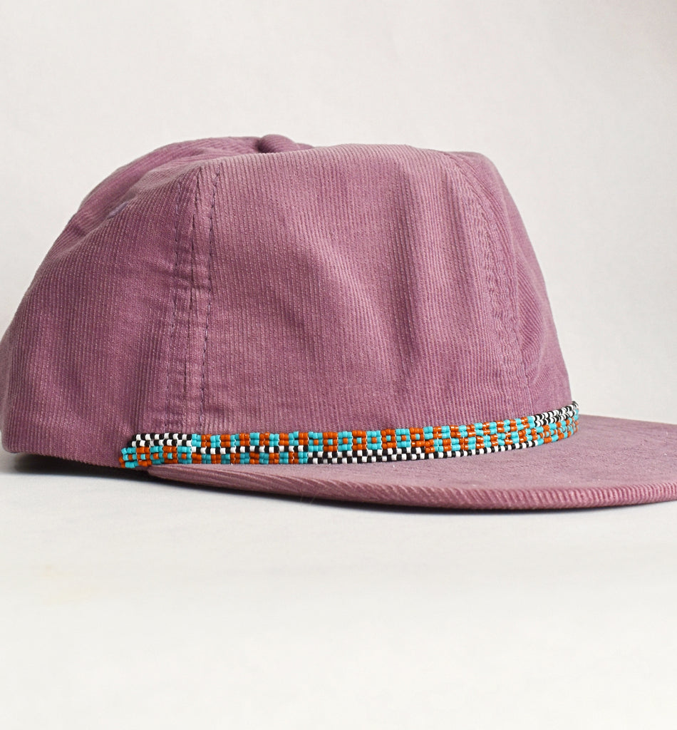 Awesome purple fine wale cord flat brim hat blank personalized with a hand beaded front band. Adjustable back band. 100% cotton hat.