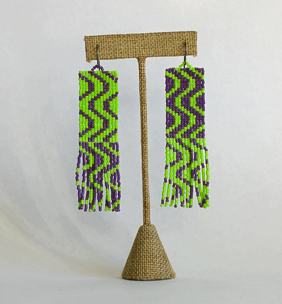 Fringe beaded earrings on niobium (hypoallergenic) ear wires. Purple and lime green colored beads. Total length including ear wires is 3.75".