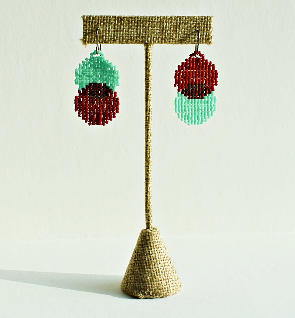 Overlapping circle beaded earrings on niobium (hypoallergenic) ear wires. Scarlet red, red picasso (marble effect) and turquoise colored beads. Total length including ear wires is 2".