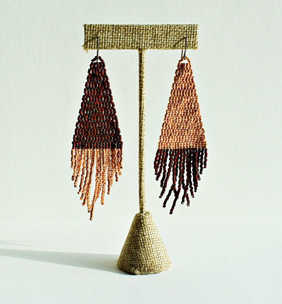 Triangle fringe beaded earrings on niobium (hypoallergenic) ear wires. Red picasso (marble effect) and copper colored beads. Total length including ear wires is 4".