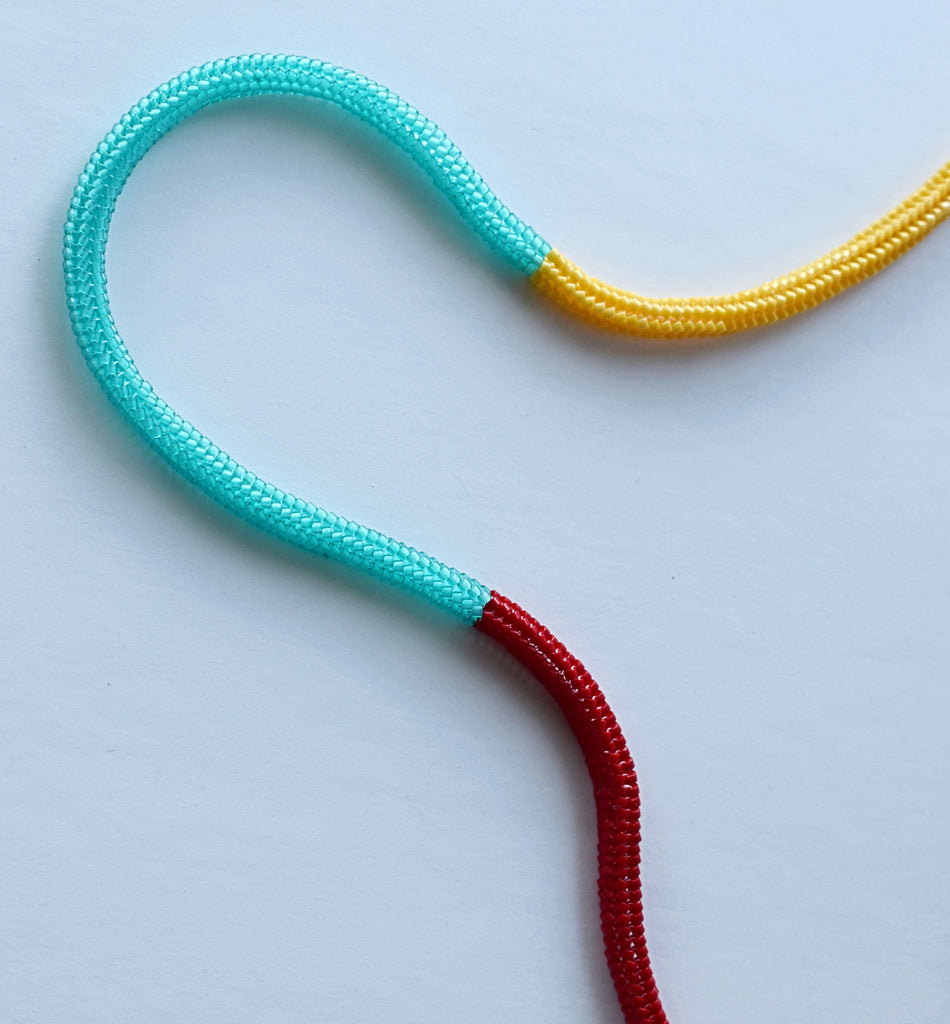 Long beaded rope can be worn as a necklace or wrapped a few times as a bracelet. 24" long without a clasp. Colorblocked in four sections with red, yellow, transparent blue and turquoise beads.