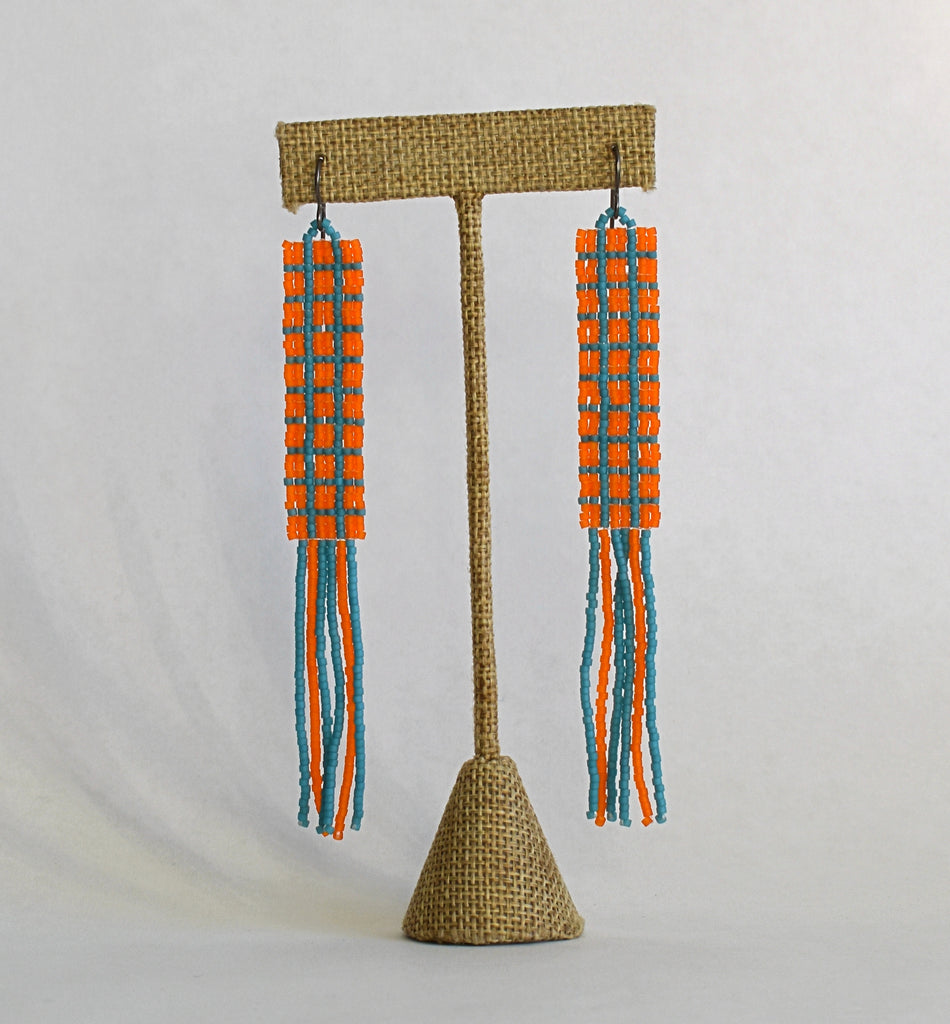 Windowpane patterned fringe beaded earrings on niobium (hypoallergenic) ear wires.  Orange and teal colored beads.  Total length including ear wires is 4.5".