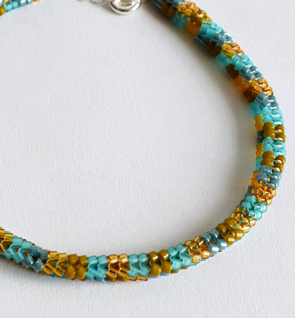 Beaded rope bracelet in checkerboard pattern with adjustable sterling silver chain and sterling silver spring ring clasp. Transparent teal and amber with opaque caramel and sea green colored Japanese seed beads. 6.5" in length with 1.5" chain adjuster.