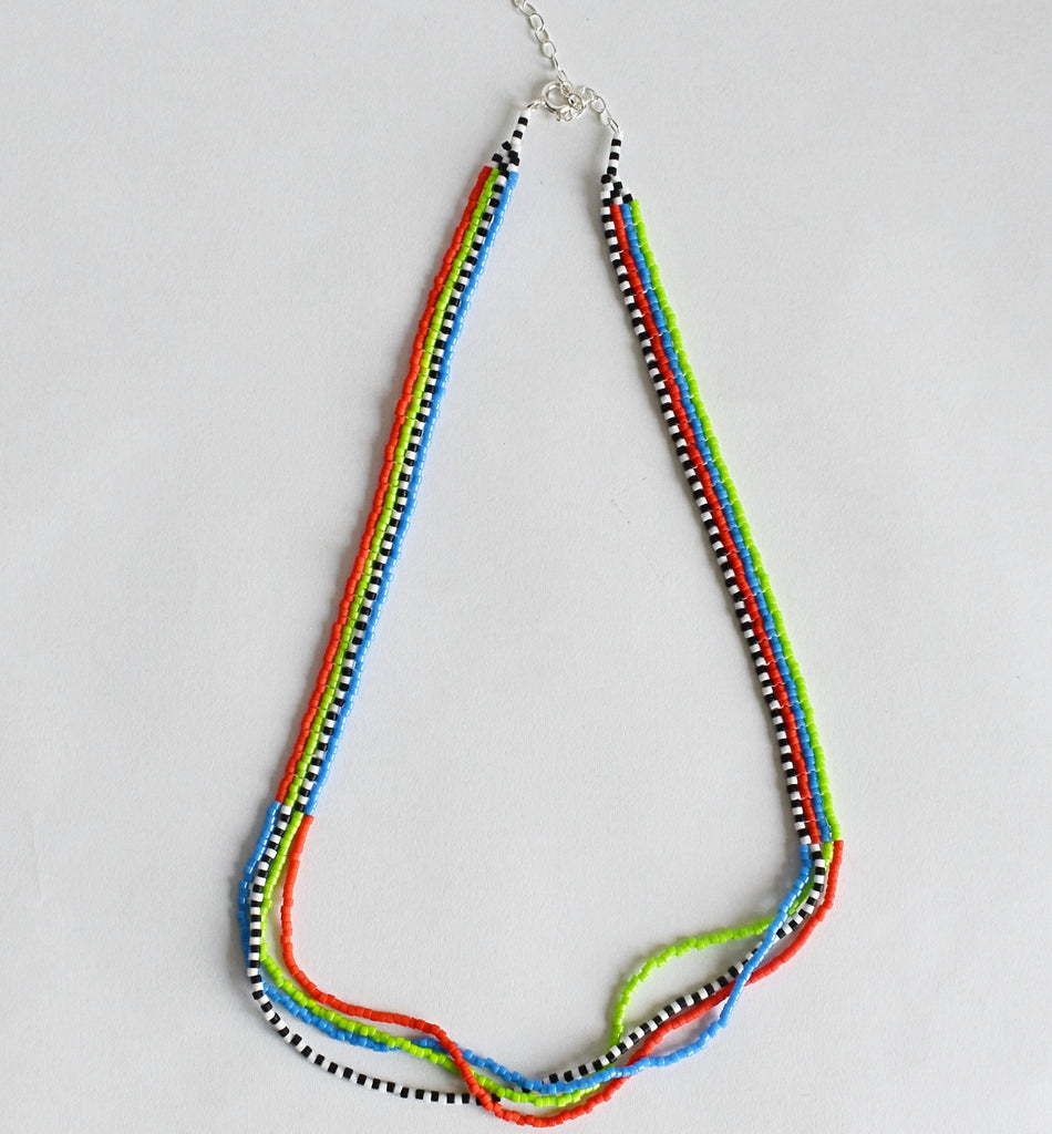 Mix up the textures with this hand beaded necklace. Half of this necklace is flat beaded with the center portion in strands. Flat section features a striped pattern while the strands are in checks. Great for everyday layering. 16" long with 2" of extender chain and sterling silver spring ring clasp.