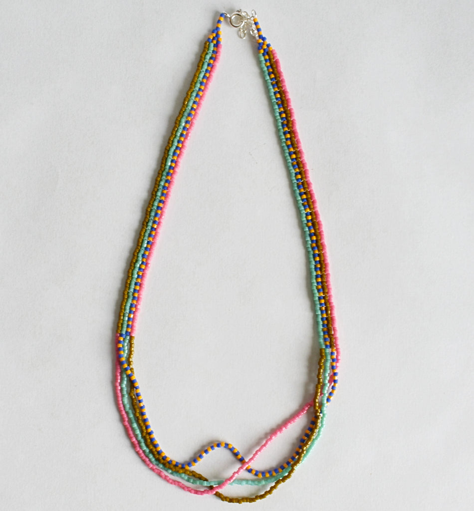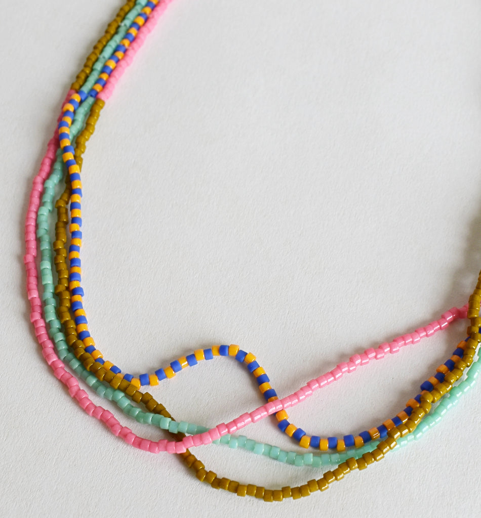Pink Aqua Olive: Opaque pink, aqua, olive, mango periwinkle, black and white Japanese seed beads.